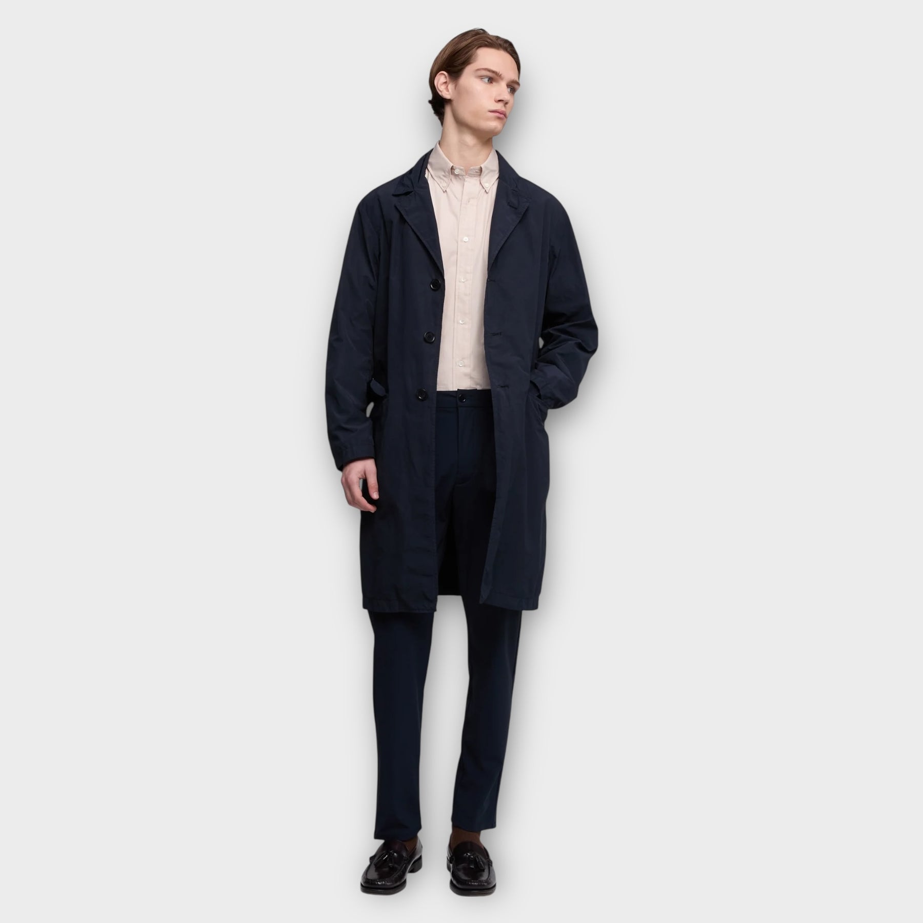 Den rene konstruktion og diskrete detaljer giver et elegant og tidløst look, mens den praktiske opbygning med hætte og lynlåslukning sikrer funktionalitet i hverdagen. Farven Navy understreger det klassiske og alsidige udtryk, der fungerer perfekt til både casual og mere velklædte outfits.