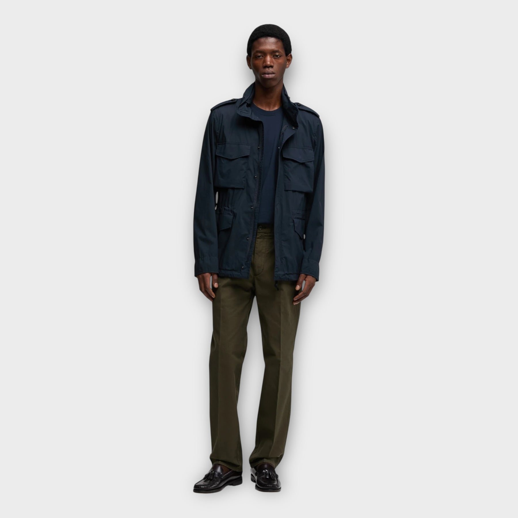Aspesi Minifield Cot i Navy er en ikonisk, let og uforet field-jakke i kompakt bomuldsgabardine med et minimalistisk, italiensk udtryk. Jakken har skjult lynlås med trykknapper, fire udvendige lommer og en justerbar snøre i taljen, som giver et funktionelt og moderne look. Et tidløst design, der fungerer både som overgangsjakke og som et stilfuldt lag over strik eller skjorte.