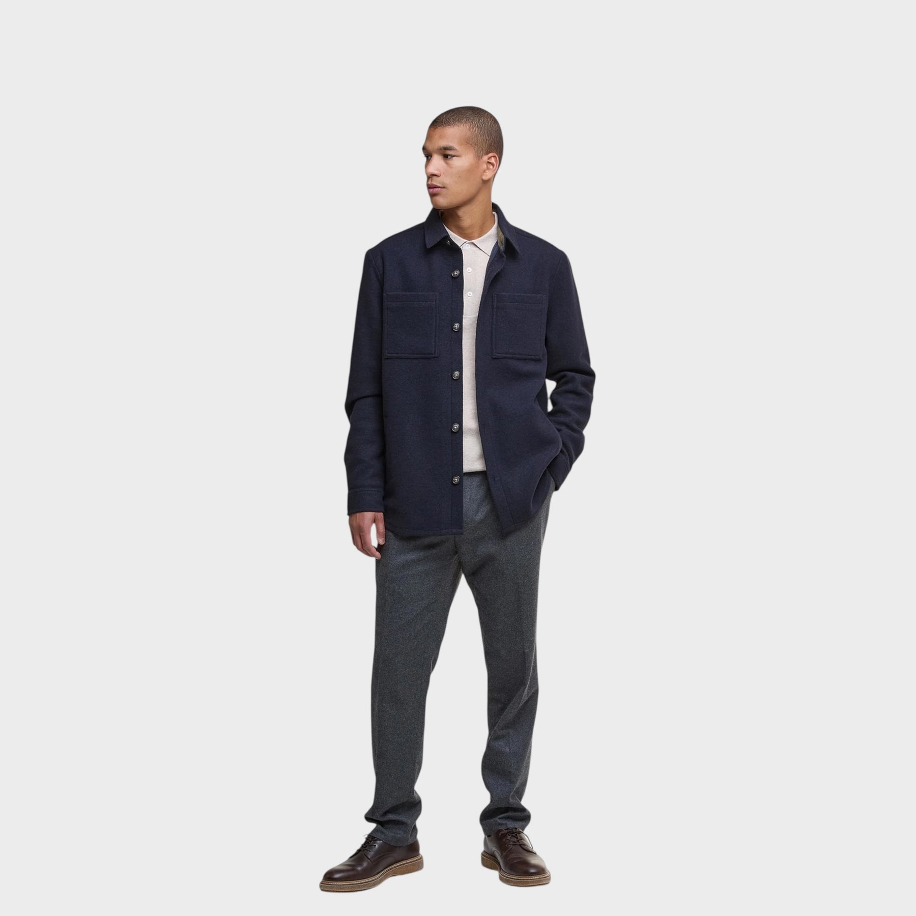 Upgrade your wardrobe with the Barbour Marlow Tailored Wool Blend Overshirt in classic navy. This wool blend overshirt combines functionality and style, perfect for everyday wear or layering over a shirt. The shirt is made from a soft wool blend of 77% polyester and 23% virgin wool. An ideal solution for men who want timeless style, functionality and high quality in one piece of clothing