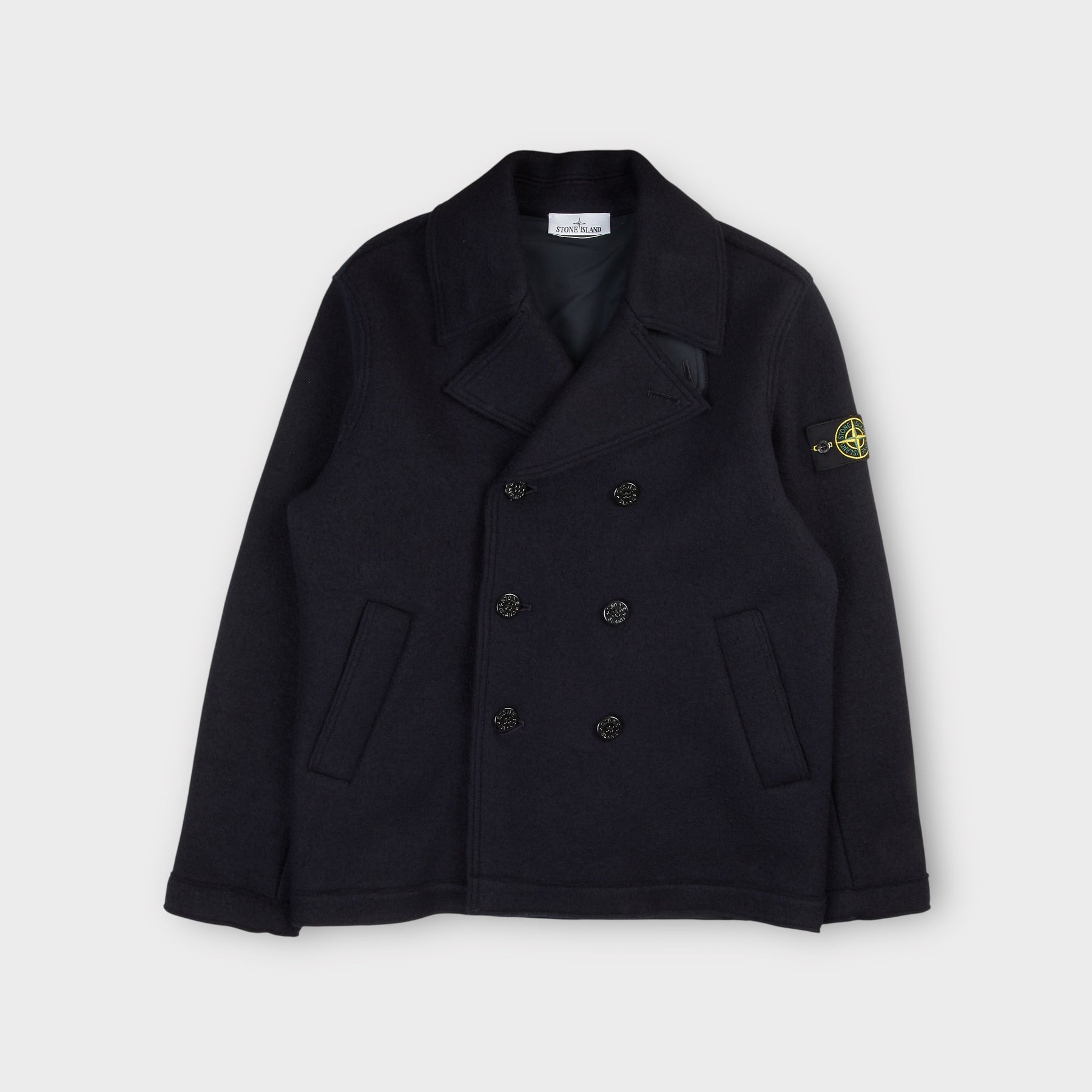 Upgrade your outerwear wardrobe with this Stone Island double-breasted pea coat in soft, RWS-certified felted wool. The jacket combines classic military inspiration with Stone Island's innovative approach to materials and fit.